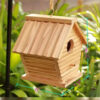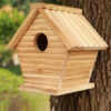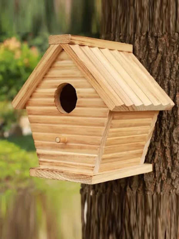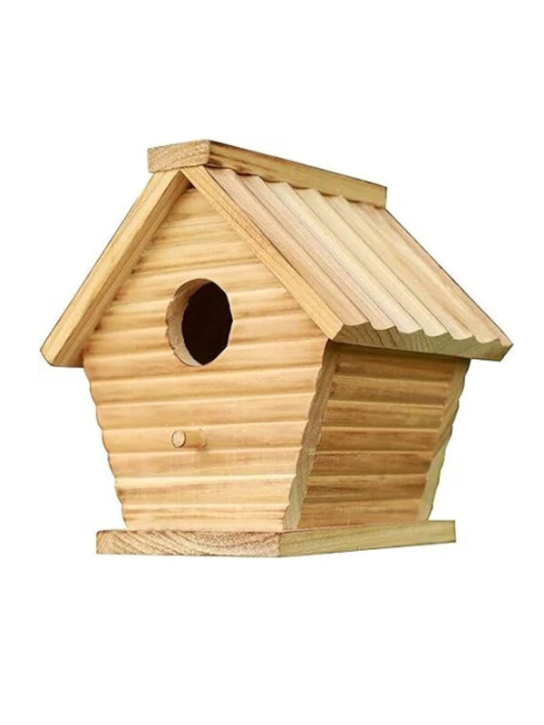 ring charm and life to your garden with this beautifully crafted wooden birdhouse. Designed with a classic slanted roof and natural wooden finish, this birdhouse blends perfectly with outdoor environments. It features a smooth circular entry hole and a small perch, making it ideal for small birds like sparrows, finches, or wrens.