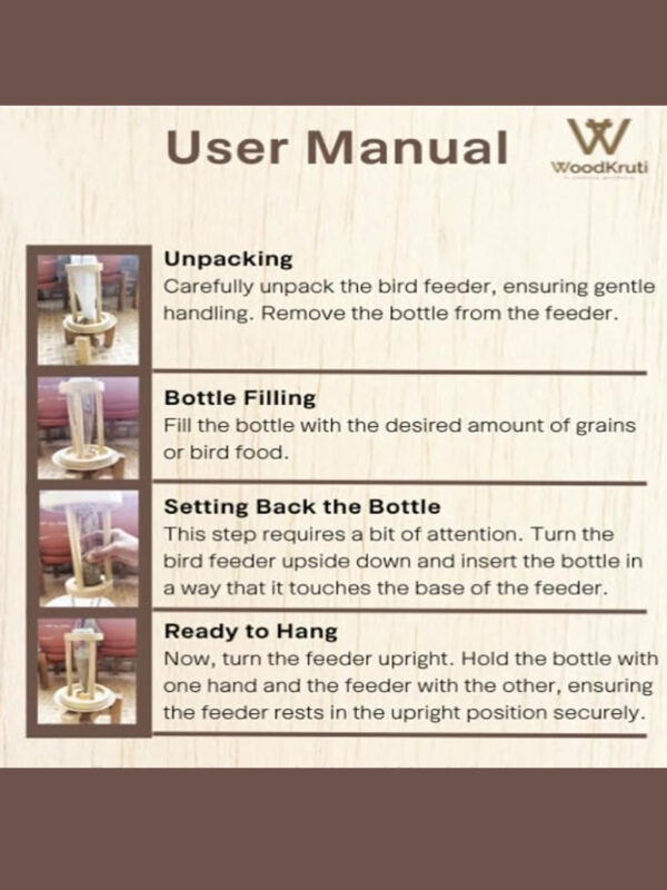 Elevate your garden’s charm with this beautifully crafted Hanging Wooden Bird Feeder with Glass Bottle Dispenser. The combination of natural wood and a repurposed glass bottle offers both style and sustainability. The cylindrical feeder is encased in a four-post wooden structure that holds the inverted bottle securely, allowing seeds to flow gently into the circular base tray as birds feed.