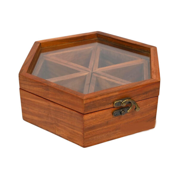 Masala Box for Kitchen Table Top Masala Dabba Containers Jars & Kitchen Spice Box | Big Size Organizer, Serving and Storing Box with Removable Partitions, Brown (1, Hexagon)