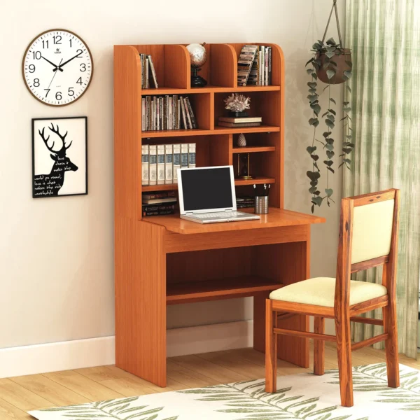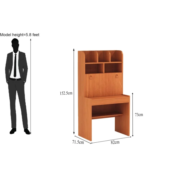 The thoughtful design includes multiple shelves to keep your books, stationery, and decor items organized, a spacious tabletop for working or studying, and additional storage below. Its warm wooden tone adds a natural elegance to your space, making it a stunning addition to your bedroom, study area, or home office.