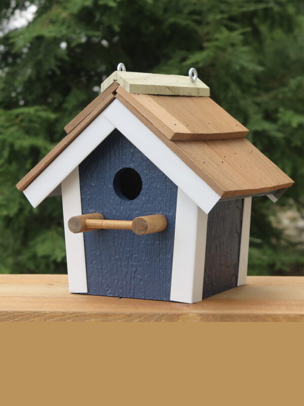 Elevate your garden style with this eye-catching Modern Triangle Birdhouse, crafted from high-quality wood and finished in a striking dual-tone color palette of navy blue and white. Designed with a sloped roof and a secure perch, it’s ideal for small birds like sparrows, tits, and finches. The sturdy structure, decorative appeal, and hanging hooks make it perfect for balconies, patios, or trees. This birdhouse isn’t just a home for birds — it’s a statement piece for nature lovers.