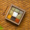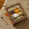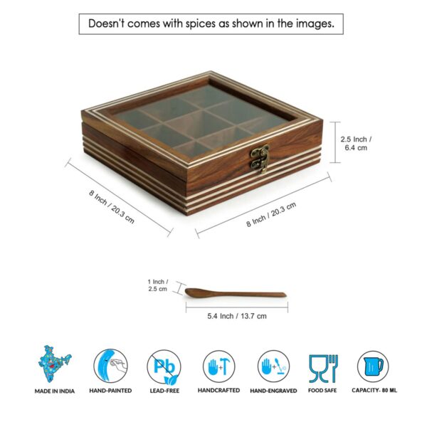 oden Spice Box for Kitchen with Spoon (9 Compartments; Non-Detachable, 80 ml, Brown & White) Masala Container Spice Box Wooden Namak Dani for Kitchen Masala Box Wooden Dani