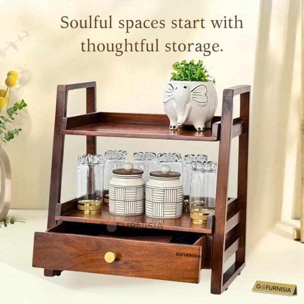 Premium Handcrafted Floor Mount Organizer with Drawer Kitchen Storage Corner Shelf/Spice Rack/Wooden Organizer/Pooja Temple/Living Room Organiser (18X11X19Inch), DIY, Brown-Walnut