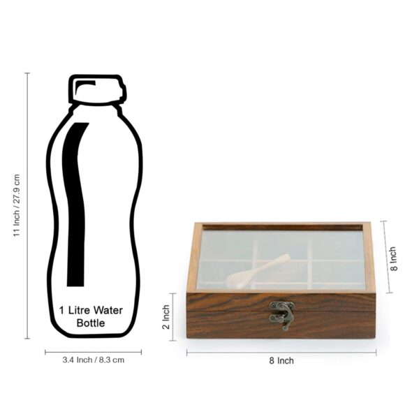 - The dimensions of Spice Box is: (L x W x H) = (8.0 x 8.0 x 2.0) Inch, Spoon is: (L x W) = (3.7 x 0.7) Inch
