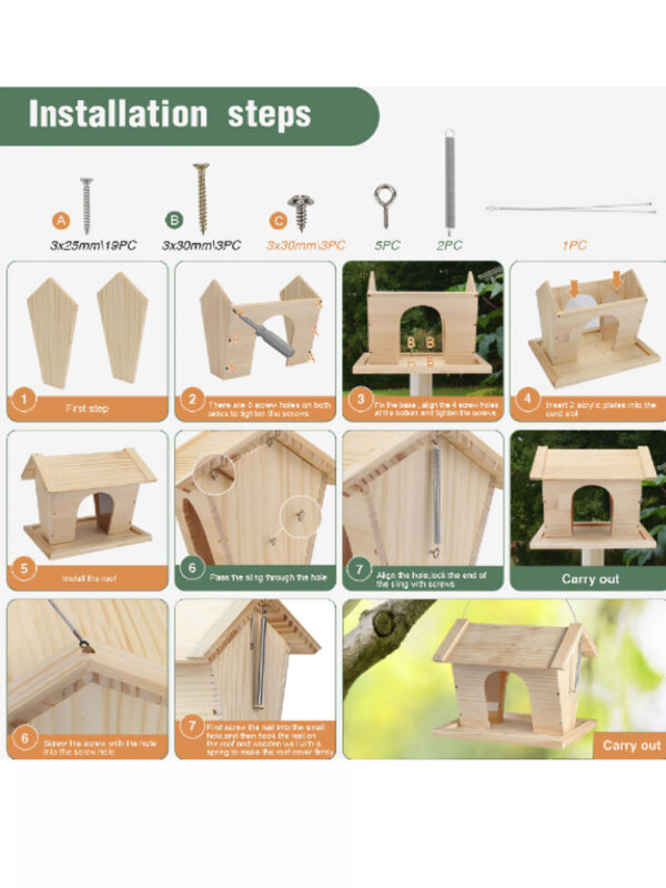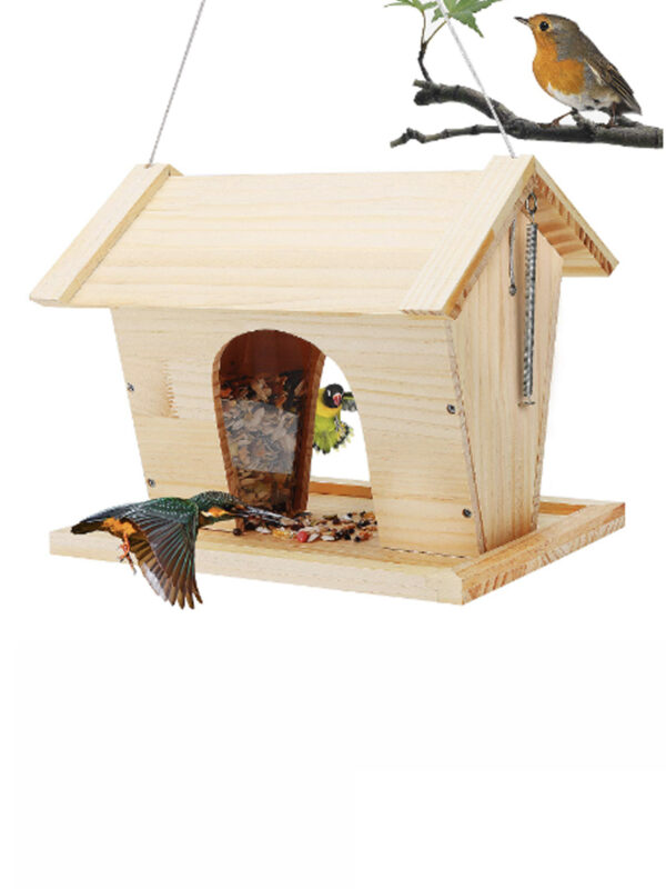 Welcome feathered friends to your garden with this beautifully handcrafted Wooden Bird Feeder. Made from smooth, natural pinewood, this feeder is both functional and visually delightful. It features a clear acrylic seed window, allowing both birds and humans to see the seed level easily and creating a fun viewing experience.