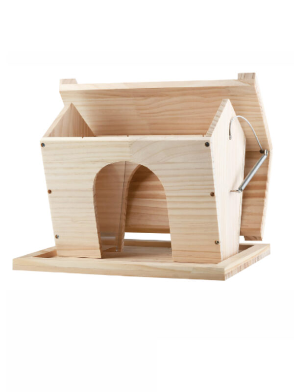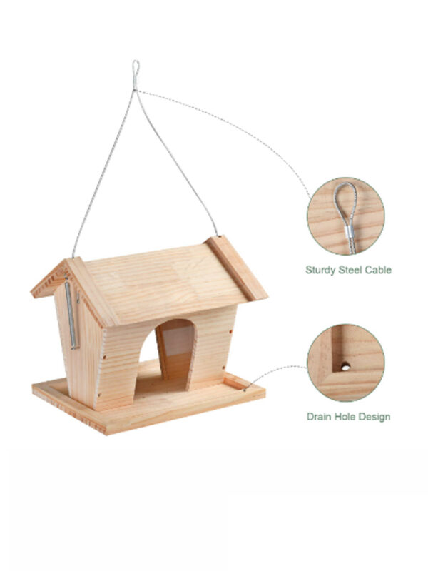 Two spacious arched entryways provide birds with easy access to feed from both sides, while the wide base tray collects any spilled seeds and acts as a comfortable landing platform. The feeder can be easily suspended using the attached metal wire, perfect for hanging from branches, poles, or balcony hooks.