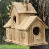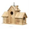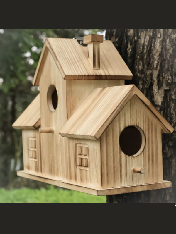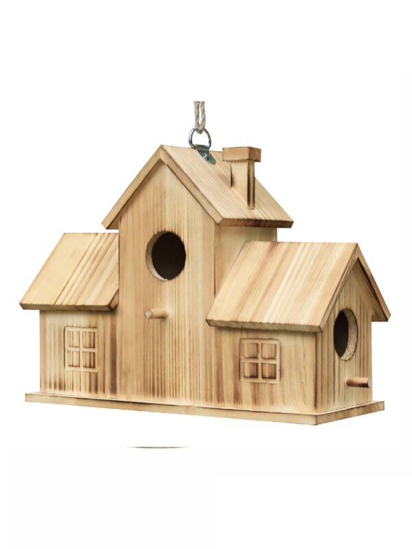 Crafted from natural, untreated wood, it provides safe and breathable shelter for small birds. Each chamber includes a round entry hole, perch, and decorative window detailing, enhancing both function and charm.